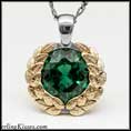 This striking laurel leaf pendant features a vibrant imitation green emerald encircled by a detailed wreath, representing victory and classic style.