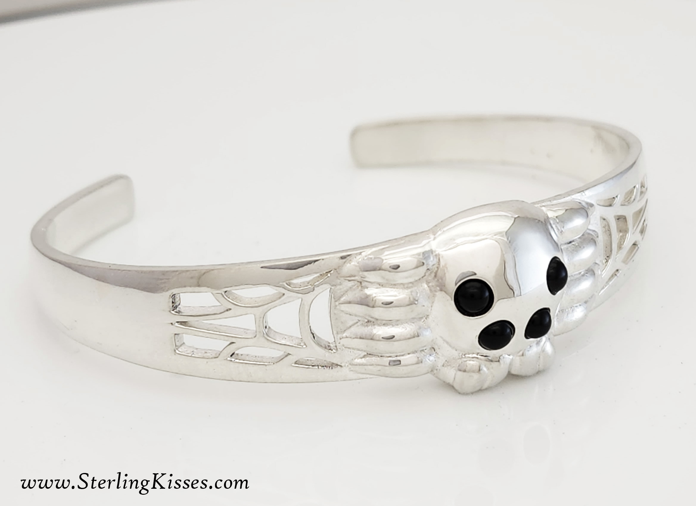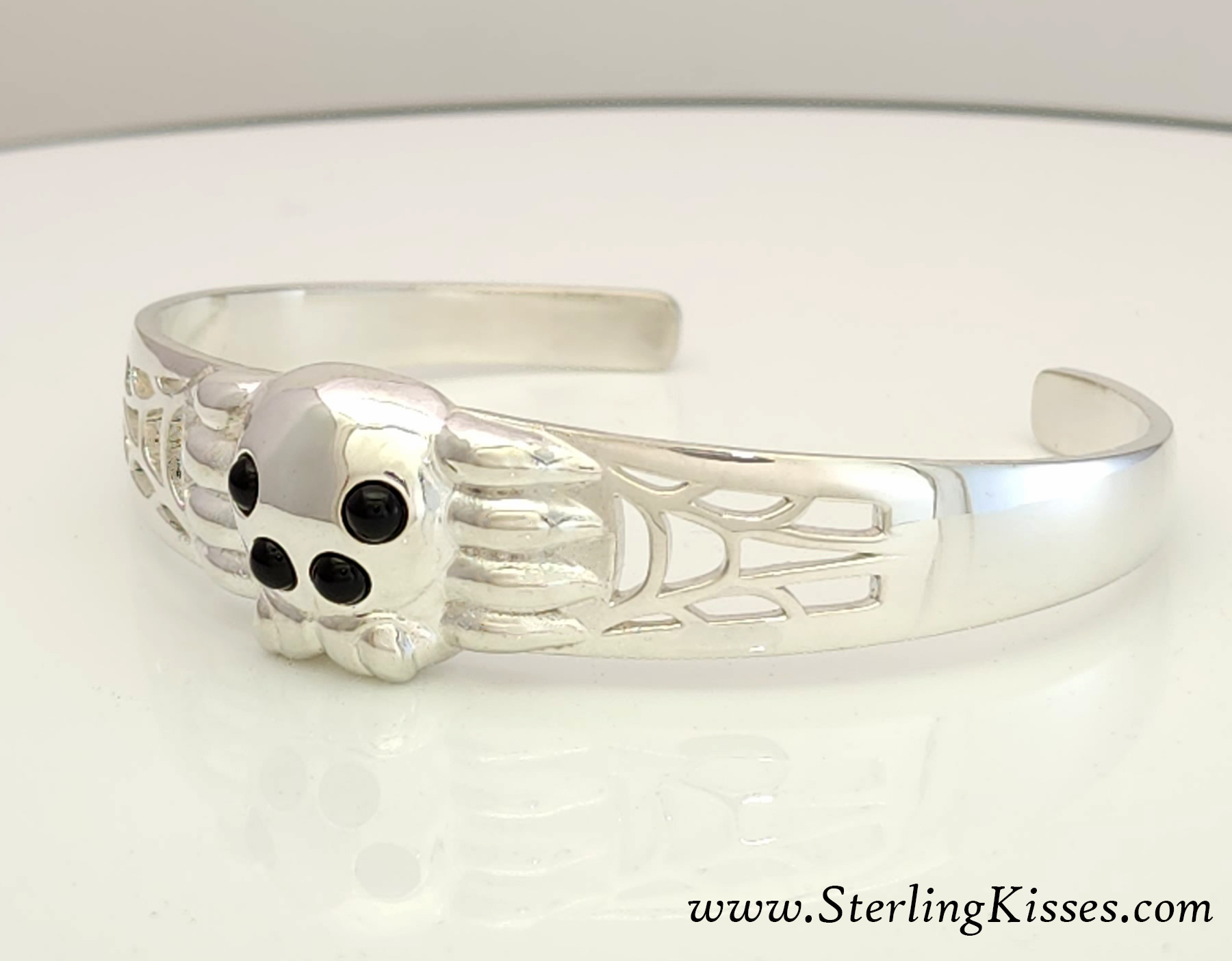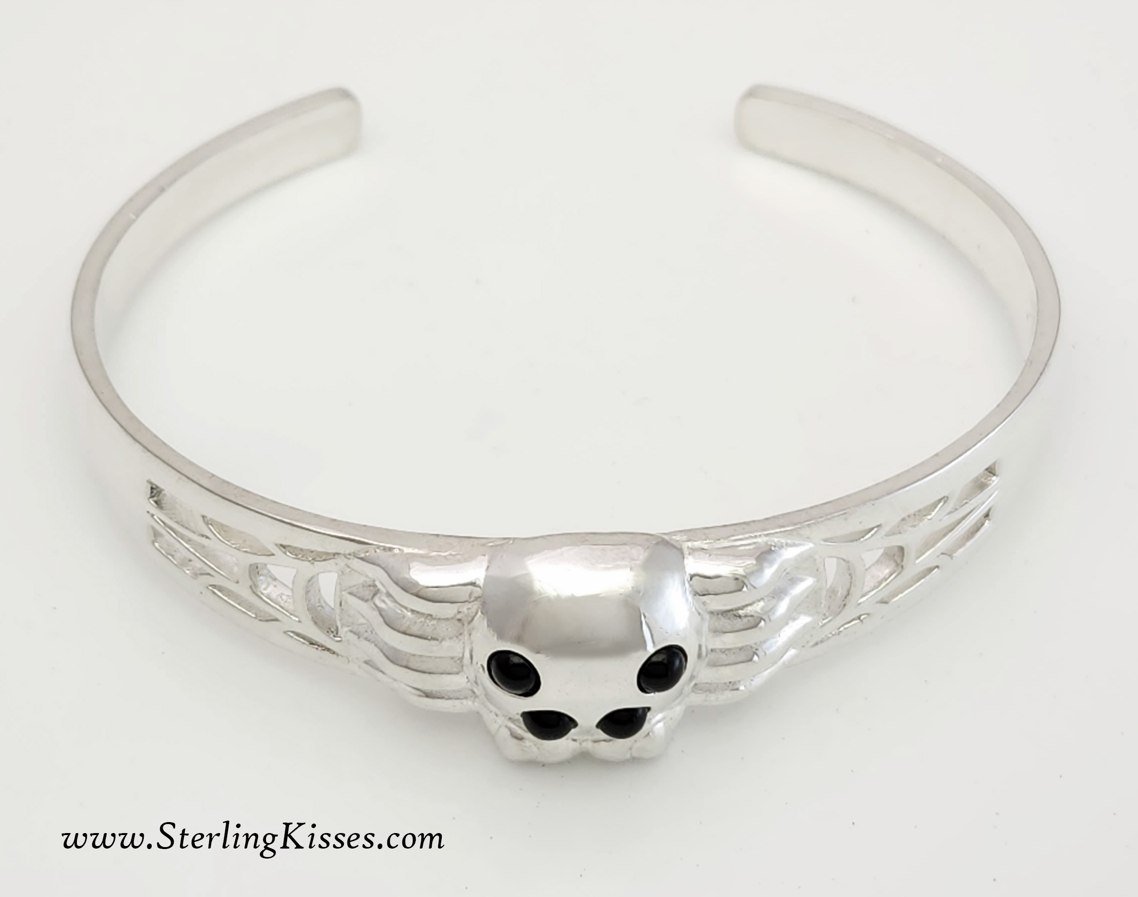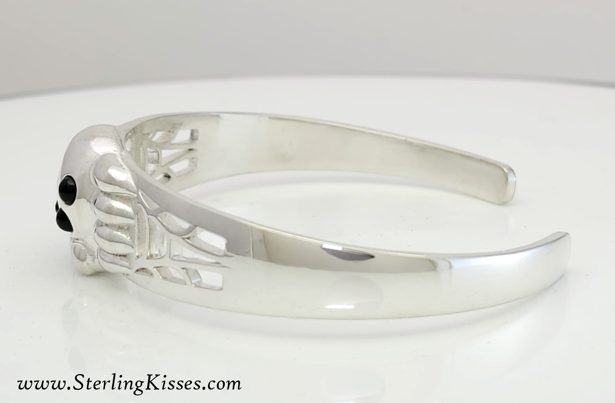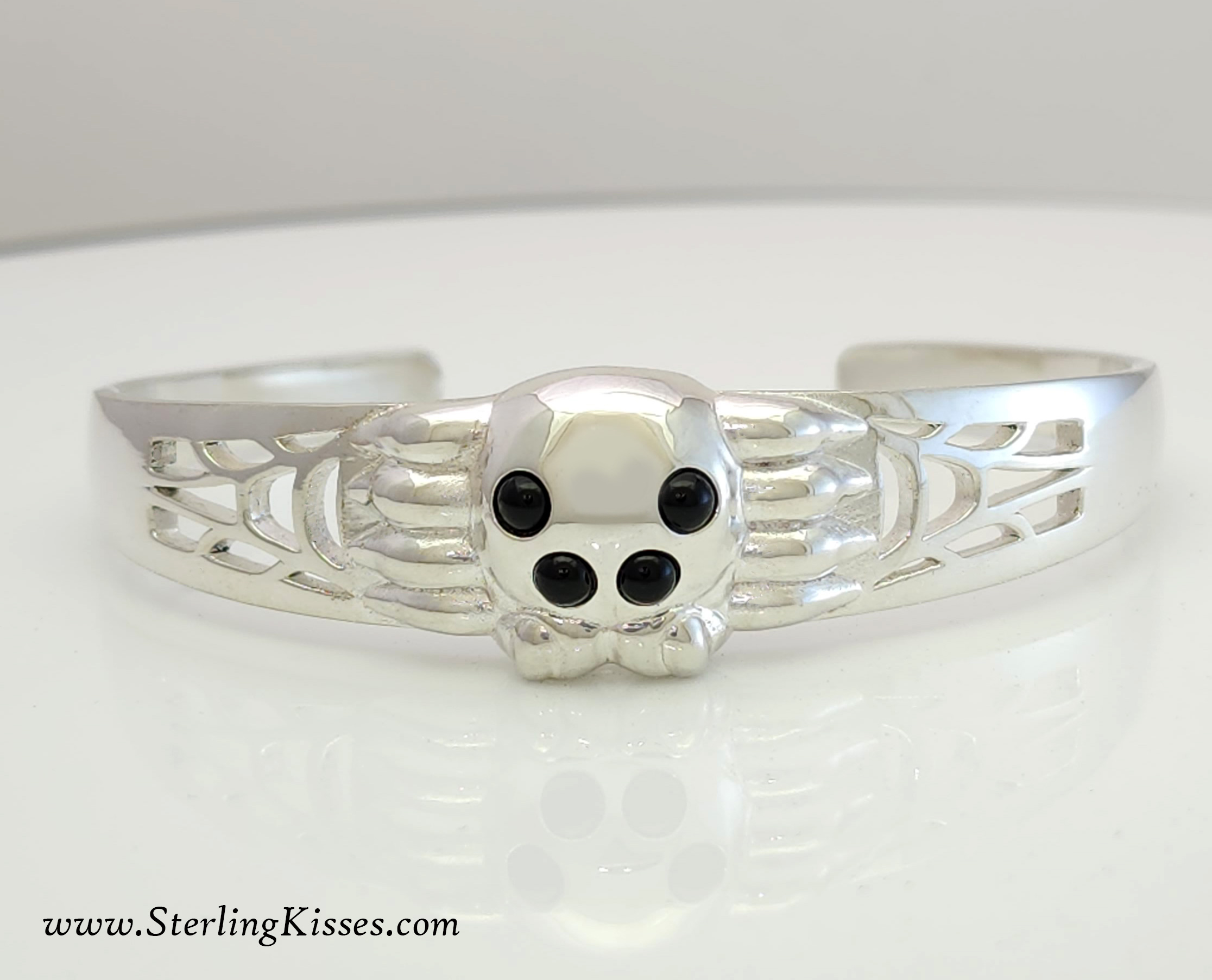 This little silver spider will be lovingly wrapped around your wrist wherever you may go. The spider's eyes are adorned with captivating black onyx, adding a touch of mystery and intrigue.